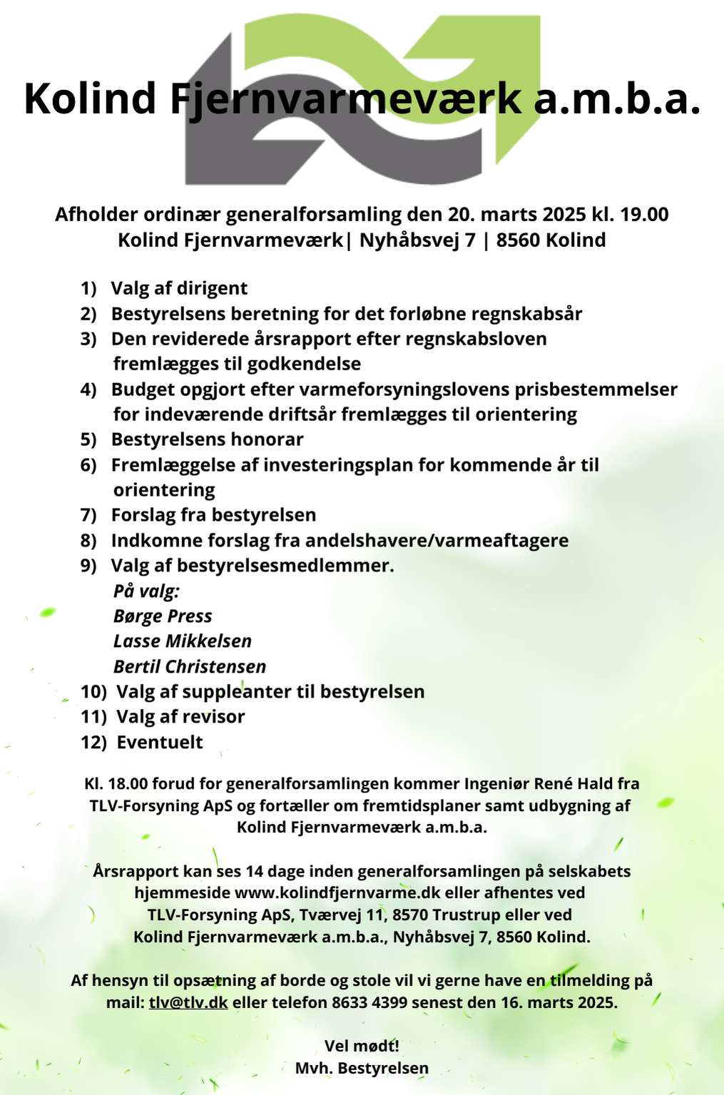 Forud for generalforsamlingen kommer ingeniør, Rene Hald, fra TLV-Forsyning ApS og fortæller om fremtidsplanerne med udbygning af Kolind Fjernvarmeværk a.m.b.a.