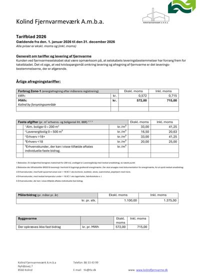 Tarifblad 2026 Kolind Fjernvarmeværk Amba